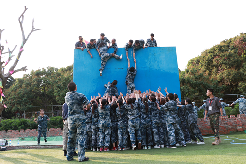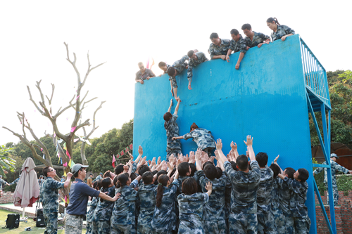 畢業墻訓練項目中4.2米的高墻,沒有任何工具; 要求所有隊員全部通過,能夠依靠的只有雙手和雙肩; 一個人的力量是有限的,但團隊的力量是無窮的!