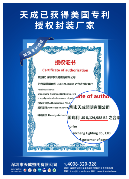 天成照明獲得矽誠科技US8124988B2專利合法封裝廠家資格,品質領先走在前列